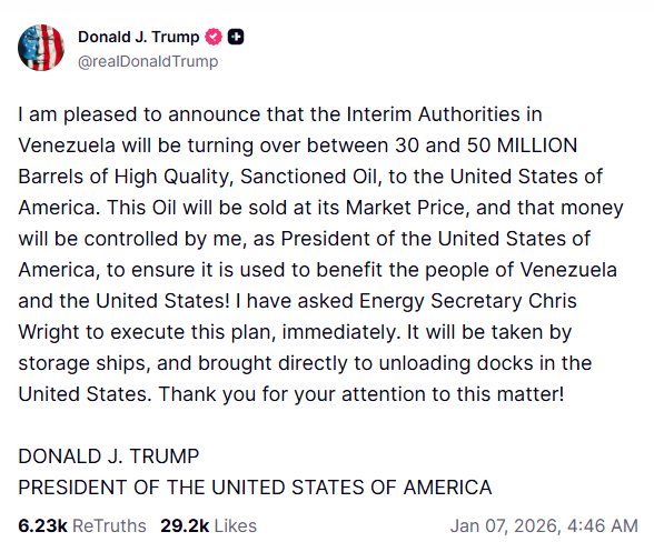 واشنگٹن (کیو این این ورلڈ) امریکی صدر ڈونلڈ ٹرمپ نے وینزویلا سے 30 سے 50 ملین بیرل اعلیٰ معیار کا خام تیل امریکا منتقل کرنے کا باقاعدہ اعلان کر دیا ہے۔ سماجی رابطے کی ویب سائٹ پر جاری کردہ اپنے ایک پیغام میں صدر ٹرمپ نے واضح کیا کہ یہ تیل امریکی مارکیٹ میں مروجہ قیمتوں پر فروخت کیا جائے گا اور اس سے حاصل ہونے والی آمدنی وہ خود کنٹرول کریں گے، جسے امریکی اور وینزویلا کے عوام کی فلاح و بہبود کے لیے استعمال کیا جائے گا۔ صدر ٹرمپ نے امریکی وزیر توانائی کرس رائٹ کو خصوصی ہدایت جاری کی ہے کہ وہ اس منصوبے پر فوری کام شروع کریں تاکہ تیل کی ترسیل امریکی بندرگاہوں تک جلد ممکن بنائی جا سکے۔