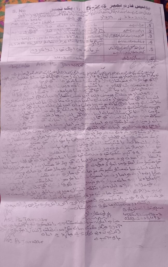 پولیس کے مطابق مقدمہ ایس ایچ او جروار اعجاز احمد جسکانی کی نگرانی میں ہیڈ محرر غلام علی گبول نے درج کیا۔ مقدمہ صحافی مشتاق علی لغاری اور اس کے کزن گلشیر لغاری پر ہونے والے حملے کے واقعے پر قائم کیا گیا۔