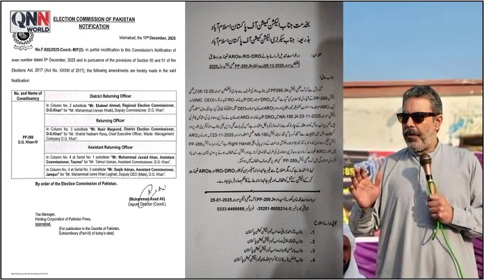 درخواست پر غور کے بعد الیکشن کمیشن آف پاکستان نے 11 دسمبر 2025ء کو باضابطہ نوٹیفیکیشن جاری کیا جس کے مطابق حلقہ PP-289 کے لیے نئے انتخابی افسران تعینات کیے گئے ہیں۔ نوٹیفیکیشن کے تحت مسٹر شکیل احمد، ریجنل الیکشن کمشنر ڈی جی خان کو نیا ڈسٹرکٹ ریٹرننگ آفیسر (DRO) مقرر کیا گیا ہے جو سابقہ DRO محمد عثمان خالد (ڈپٹی کمشنر ڈی جی خان) کی جگہ ذمہ داریاں سنبھالیں گے۔