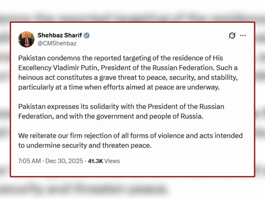 اسلام آباد (ویب ڈیسک) وزیراعظم پاکستان شہباز شریف نے روسی صدر ولادیمیر پیوٹن کی سرکاری رہائش گاہ کو ڈرونز کے ذریعے نشانہ بنانے کی مبینہ کوشش کی سخت الفاظ میں مذمت کرتے ہوئے اسے عالمی امن اور استحکام کے لیے ایک سنگین خطرہ قرار دیا ہے۔ سماجی رابطے کی ویب سائٹ ایکس پر جاری اپنے ایک بیان میں وزیراعظم نے واضح کیا کہ اس نوعیت کے گھناؤنے اقدامات نہ صرف سلامتی کو نقصان پہنچاتے ہیں بلکہ ان کوششوں کو بھی سبوتاژ کرتے ہیں جو خطے میں امن کی بحالی کے لیے کی جا رہی ہیں۔ انہوں نے روسی صدر، حکومت اور عوام کے ساتھ مکمل یکجہتی کا اظہار کرتے ہوئے اس عزم کا اعادہ کیا کہ پاکستان ہر قسم کے تشدد اور ایسی کارروائیوں کو مسترد کرتا ہے جو بین الاقوامی امن کے لیے خطرہ بنیں۔