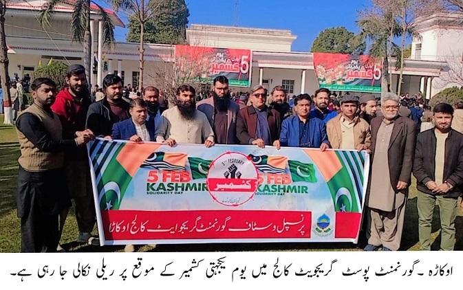 اوکاڑہ (کیو این این ورلڈ/بیوروچیف ملک ظفر) گورنمنٹ گریجویٹ کالج اوکاڑہ میں یومِ یکجہتی کشمیر کے حوالے سے ایک پروقار سیمینار اور ریلی کا انعقاد کیا گیا جس میں کشمیری عوام کی جدوجہدِ آزادی اور ان پر ہونے والے مظالم کو بھرپور طریقے سے اجاگر کیا گیا۔ سیمینار کی نظامت ڈاکٹر حسن رضا اقبالی نے نہایت خوش اسلوبی سے انجام دی جبکہ پروفیسر عثمان غنی اور پروفیسر حسیب افتخار نے اپنے خطاب میں کشمیریوں کی لازوال قربانیوں پر روشنی ڈالی۔
