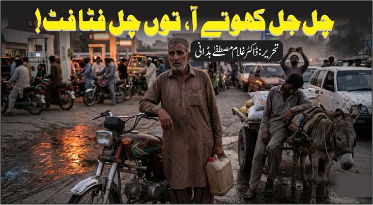 ایک طرف وفاقی وزیرِ پیٹرولیم صاحب کا وہ روایتی بیان ہے کہ "عالمی منڈی میں قیمتیں کم ہوئیں تو عوام کو فوری ریلیف دیں گے”، جبکہ دوسری طرف عوام یہ تلخ حقیقت جانتے ہیں کہ جب تیل مہنگا کرنا ہو تو رات کے بارہ بجنے کا انتظار بھی نہیں کیا جاتا، لیکن جب قیمتیں کم کرنے کی باری آئے تو "دیکھتے ہیں، سوچتے ہیں اور جائزہ لیتے ہیں” جیسے بہانے تراشے جاتے ہیں۔ یہ بالکل ویسا ہی منظر ہے جیسے کوئی لاچار کھوتا بوجھ اٹھا اٹھا کر تھک چکا ہو، اس کی ٹانگیں کانپ رہی ہوں، مگر مالک اپنی سوٹی لہراتے ہوئے کہہ رہا ہو "چل جل کھوتے آ”۔ اب پیٹرول پمپس پر جو طویل قطاریں نظر آتی ہیں، وہ محض ایندھن بھروانے والوں کا رش نہیں بلکہ ان خوفزدہ لوگوں کا ہجوم ہے جو سوچتے ہیں کہ آج ٹینکی فل کروا لو، ورنہ کل یہ پیٹرول سونے کے بھاؤ بکے گا۔