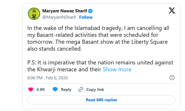 لاہور (کیو این این ورلڈ) وفاقی دارالحکومت اسلام آباد میں ہونے والے ہولناک خودکش دھماکے کے سوگ میں وزیر اعلیٰ پنجاب مریم نواز نے کل بسنت کے حوالے سے اپنی تمام طے شدہ مصروفیات منسوخ کر دی ہیں۔ سماجی رابطے کے پلیٹ فارم ایکس پر اپنے ایک بیان میں انہوں نے واضح کیا کہ لبرٹی اسکوائر پر منعقد ہونے والا "میگا بسنت شو” بھی اب منعقد نہیں کیا جائے گا۔
