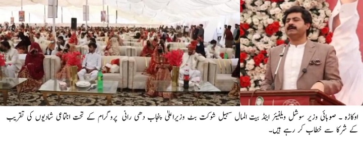 اوکاڑہ (کیو این ورلڈ/بیورو چیف ملک ظفر ):وزیراعلیٰ پنجاب مریم نواز شریف کے دھی رانی پروگرام کے تحت اوکاڑہ میں اجتماعی شادیوں کی چوتھی پروقار تقریب منعقد ہوئی، جس میں ضلع اوکاڑہ کی 90 بیٹیوں کے شرعی فریضۂ نکاح کی ادائیگی کر دی گئی۔ تقریب میں صوبائی وزیر سوشل ویلفیئر اینڈ بیت المال سہیل شوکت بٹ نے بطور مہمانِ خصوصی شرکت کی۔