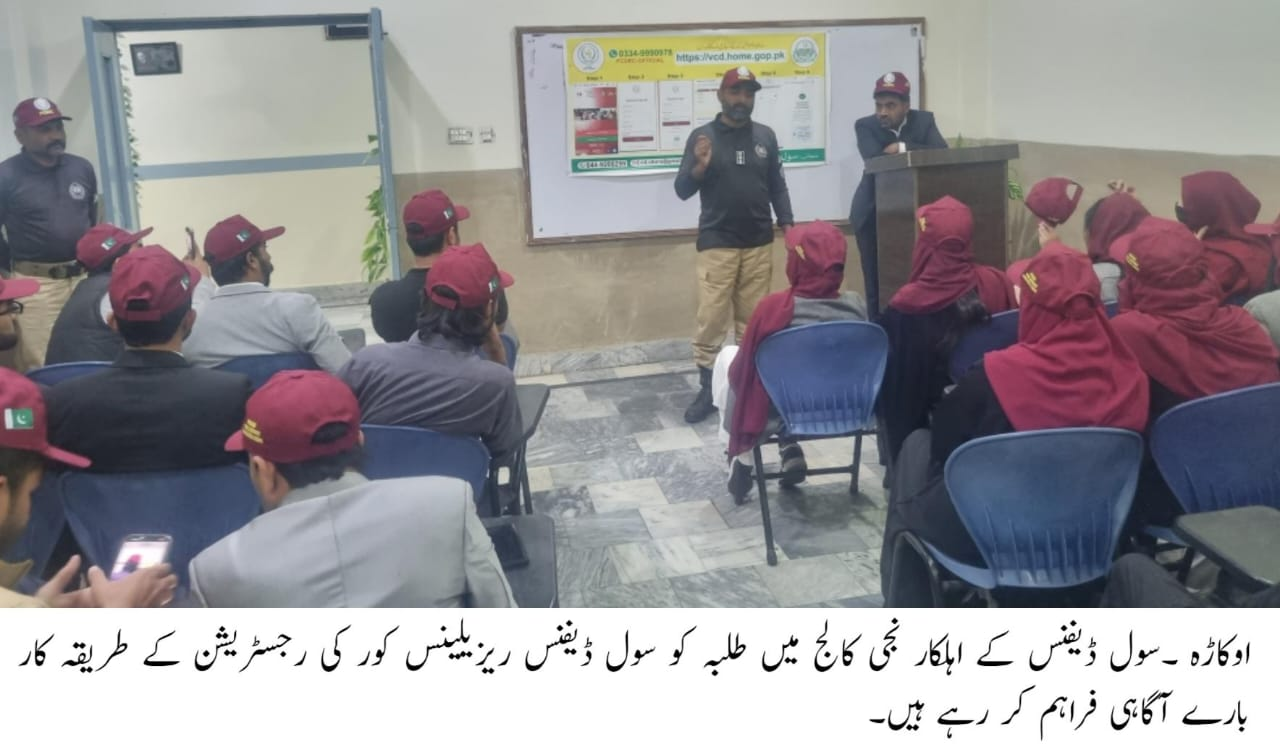 سول ڈیفنس افسران نے شرکاء کو ریزیلینس کور میں شمولیت کے طریقہ کار، رجسٹریشن کے مراحل اور رضاکارانہ خدمات کی اہمیت سے آگاہ کیا۔ اس موقع پر سول ڈیفنس آفیسر جاوید اختر کھچی نے کہا کہ سول ڈیفنس ریزیلینس کور کا مقصد ہنگامی حالات، قدرتی آفات اور مختلف حادثات کے دوران بروقت اور مؤثر امداد کی فراہمی کو یقینی بنانا ہے۔