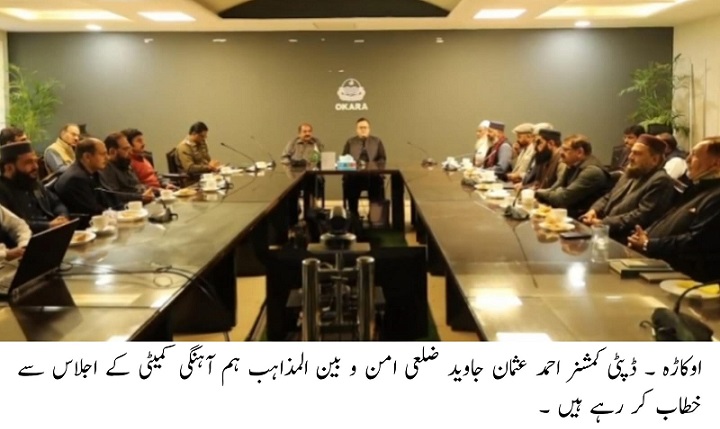 اوکاڑہ (کیو این این ورلڈ/ بیورو چیف ملک ظفر) ڈپٹی کمشنر احمد عثمان جاوید کی زیر صدارت ضلعی امن و بین المذاہب ہم آہنگی کمیٹی کا اہم اجلاس منعقد ہوا، جس میں رمضان المبارک کے دوران امن عامہ، رواداری اور عوامی ریلیف کے حوالے سے اہم فیصلے کیے گئے۔ اجلاس میں ممبر صوبائی اسمبلی چوہدری جاوید علاؤالدین، انتظامی و پولیس حکام، انجمن تاجران کے نمائندوں، امن کمیٹی کے اراکین اور جید علمائے کرام نے شرکت کی۔ اجلاس میں طے پایا کہ تحصیل اوکاڑہ میں سہولت بازار جبکہ تحصیل دیپالپور میں اپنی مدد آپ کے تحت رمضان بازار لگائے جائیں گے تاکہ شہریوں کو سستی اشیاء خوردونوش کی فراہمی یقینی بنائی جا سکے۔ ڈپٹی کمشنر نے تاجر برادری پر زور دیا کہ وہ مقدس مہینے کے احترام میں عوام کو خصوصی ریلیف فراہم کریں، جبکہ مخیر حضرات کے تعاون سے ضلع کے 6 بڑے ہسپتالوں میں رمضان دسترخوان بھی قائم کیے جائیں گے۔