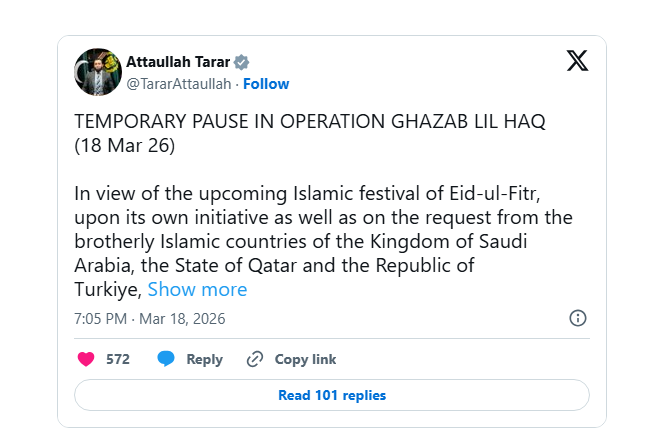 اسلام آباد (کیو این این ورلڈ) وزیر اطلاعات عطا تارڑ نے اعلان کیا ہے کہ عید الفطر کے احترام اور برادر اسلامی ممالک کی درخواست پر آپریشن غضب للحق عارضی طور پر روک دیا گیا ہے۔