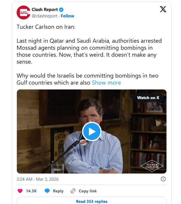 ٹکر کارلسن کے مطابق گزشتہ رات قطر اور سعودی عرب کے حکام نے مشترکہ کارروائیوں کے دوران ان مبینہ ایجنٹس کو حراست میں لیا، جو ان دونوں اسلامی ممالک میں بڑے پیمانے پر بم دھماکوں کی منصوبہ بندی کر رہے تھے۔