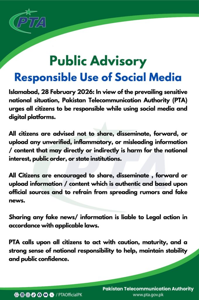 اسلام آباد(کیو این این ورلڈ)موجودہ حساس قومی صورتحال کے پیش نظر پاکستان ٹیلی کمیونیکیشن اتھارٹی (پی ٹی اے) نے عوام کے نام ایک اہم پبلک ایڈوائزری جاری کی ہے جس میں شہریوں سے سوشل میڈیا اور دیگر ڈیجیٹل پلیٹ فارمز کے استعمال میں ذمہ داری اور احتیاط برتنے کی اپیل کی گئی ہے۔