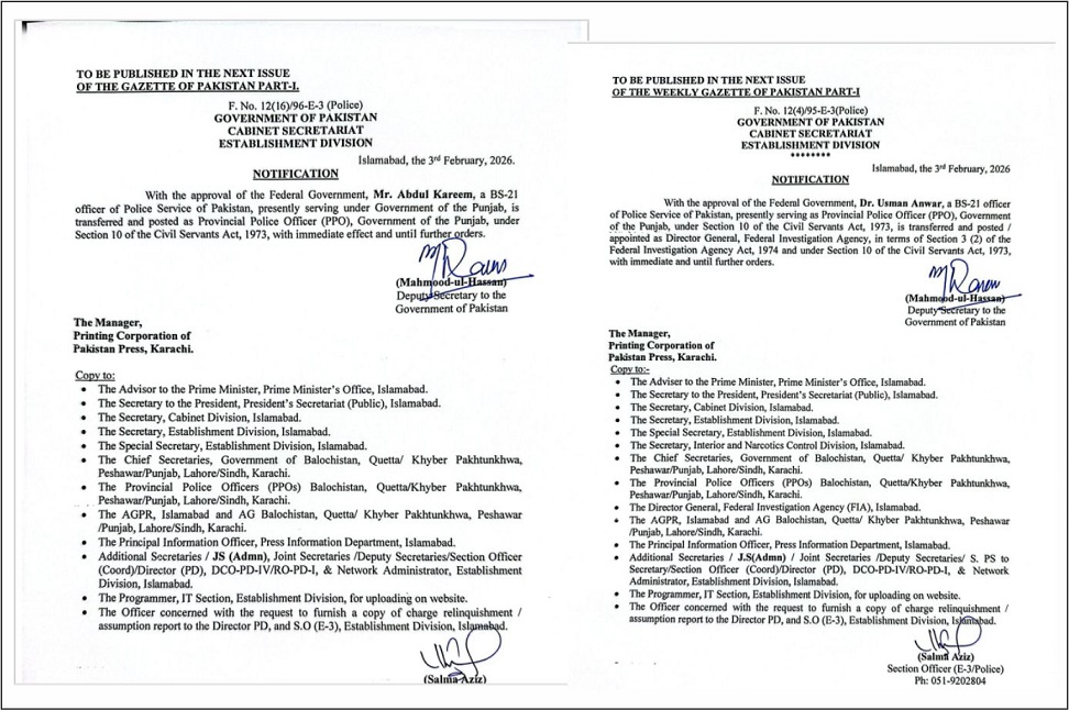 دوسری جانب ڈاکٹر عثمان انور کو ڈی جی ایف آئی اے تعینات کر دیا گیا ہے۔ ڈاکٹر عثمان انور کو 24 جنوری 2023ء کو آئی جی پنجاب مقرر کیا گیا تھا، اور انہوں نے 24 فروری 2023ء سے 2 فروری 2026ء تک بطور آئی جی پنجاب تین سال سے زائد عرصہ فرائض انجام دیے۔