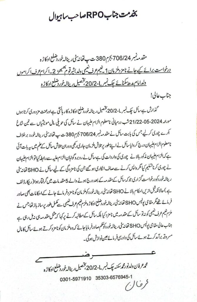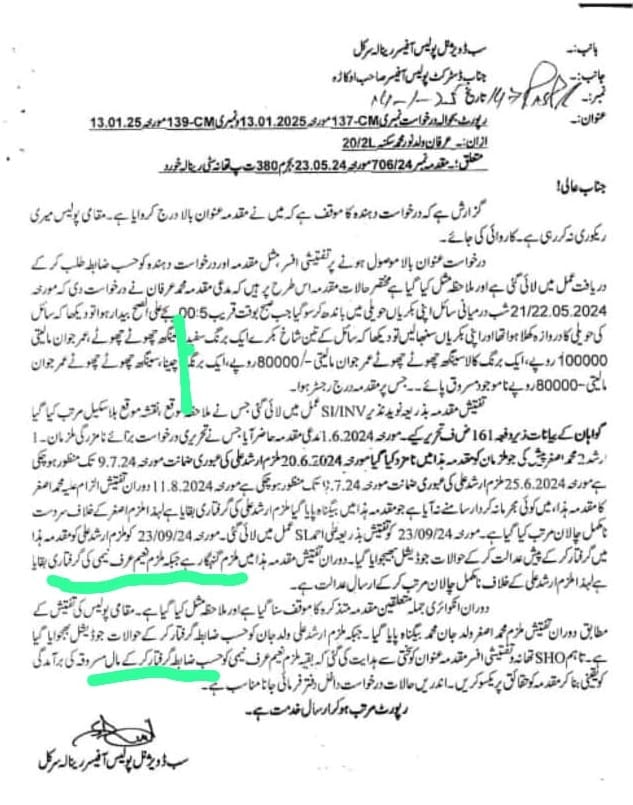 متاثرہ مدعیان نے انصاف کے حصول کے لیے آر پی او اور ڈی پی او کو بھی درخواستیں گزاری ہیں لیکن تاحال کوئی شنوائی نہیں ہوئی۔ انصاف نہ ملنے پر متاثرہ شہریوں محمد عرفان اور تسلیم نے وزیراعلیٰ پنجاب سے مطالبہ کیا ہے کہ ذمہ دار پولیس افسران کے خلاف فوری کارروائی کی جائے اور انہیں میرٹ پر انصاف فراہم کیا جائے۔
