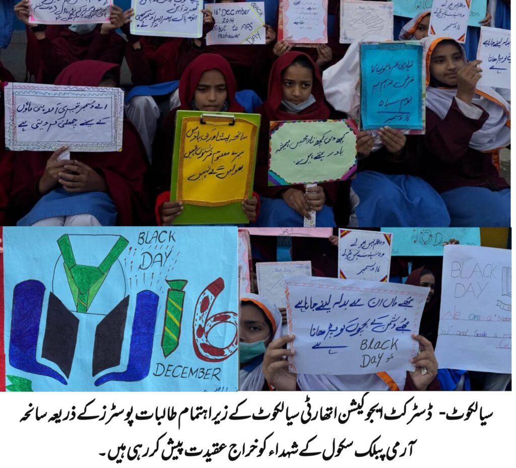 تفصیلات کے مطابق سیالکوٹ میں سانحہ آرمی پبلک سکول کی یاد میں ڈسٹرکٹ ایجوکیشن اتھارٹی کے زیر اہتمام تمام سرکاری سکولوں میں یادگاری تقاریب منعقد کی گئیں۔ ان تقاریب کا مقصد شہدائے آرمی پبلک سکول کو خراج عقیدت پیش کرنا اور طلبہ میں وطن سے محبت اور قربانی کے جذبے کو فروغ دینا تھا۔
