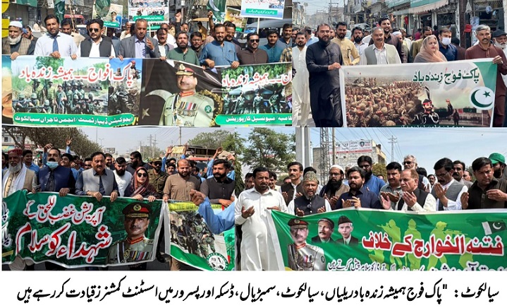 سیالکوٹ شہر میں مرکزی ریلی کی قیادت اسسٹنٹ کمشنر رانا صفدر شبیر نے کی، جس میں چیف آفیسر میونسپل کارپوریشن زبیر وٹو سمیت دیگر حکام اور ممتاز تجارتی رہنما شریک ہوئے۔ شرکاء نے قومی پرچم اور پلے کارڈز اٹھا رکھے تھے اور "پاک فوج زندہ باد” کے فلک شگاف نعروں سے فضا گونج اٹھی، جس سے شہر کا ماحول حب الوطنی کے رنگ میں رنگ گیا۔