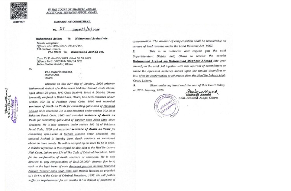 اوکاڑہ ( کیو این این ورلڈ/بیوروچیف ملک ظفر)ایڈیشنل سیشن جج اوکاڑہ شہزاد احمد کی عدالت نے تہرے قتل کے مقدمے کا فیصلہ سناتے ہوئے مرکزی مجرم ارشد کو تین مرتبہ سزائے موت کا حکم سنا دیا۔ عدالت نے مجرم کو پانچ لاکھ روپے جرمانے کی سزا بھی سنائی۔