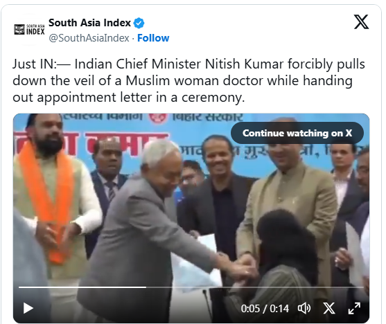 تفصیلات کے مطابق بھارتی وزیراعظم نریندر مودی کے دورِ حکومت میں مسلمان خواتین کے مذہبی لباس سے متعلق پابندیوں اور تعصب کے خدشات میں ایک اور واقعہ سامنے آ گیا۔ بھارتی ریاست بہار کے دارالحکومت پٹنہ میں ایک سرکاری تقریب کے دوران وزیراعلیٰ نتیش کمار نے مبینہ طور پر ایک مسلمان خاتون کا نقاب کھینچ دیا، جس پر شدید ردعمل دیکھنے میں آ رہا ہے۔
